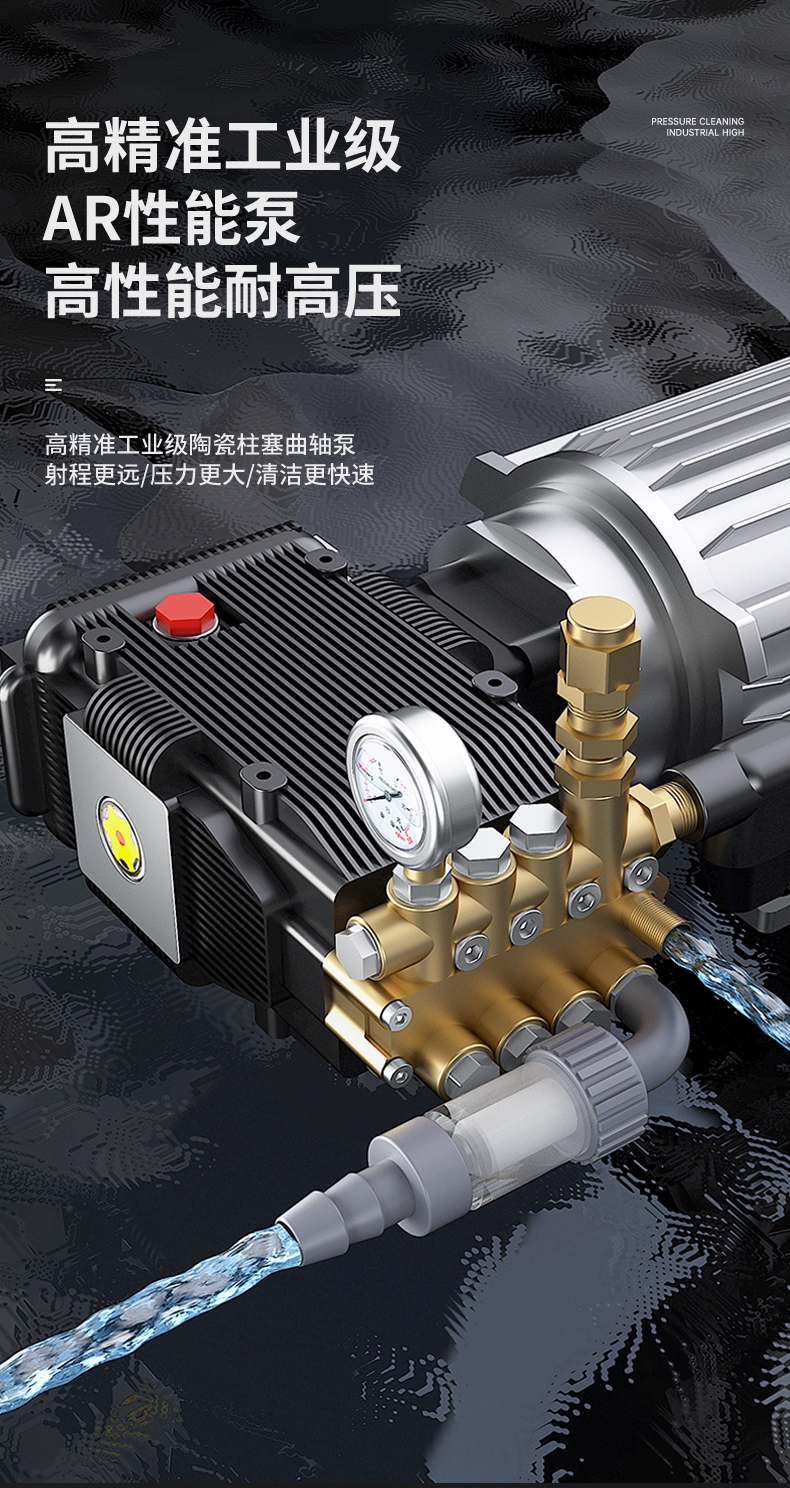 語音安全故障提醒,陶瓷柱塞曲軸泵,品牌變速箱,可視壓力調(diào)節(jié)系統(tǒng),壓力保護(hù)裝置,多種水型任意切換,密度進(jìn)水過濾系統(tǒng),品牌雙缸強(qiáng)勁壓力,加厚橡膠減震輪胎